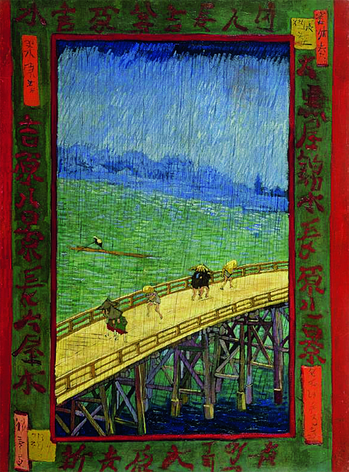 通过对本系列图书的通读,读者也能看到艺术流派和画家之间的相互影响、借鉴。浮世绘的呈现参考了中国山水画的散点透视和中国工笔画晕染的意境;马蒂斯鲜明大胆的用色,正是深受莫奈、梵高的印象派画法影响;梵高则被东方绘画风格吸引,多次尝试将浮世绘与油画风格结合,他的作品《雨中桥》《盛开的梅树》都是在这种背景下诞生的。东西方文化在交流中相互滋养的历史轨迹,在书中清晰可见。