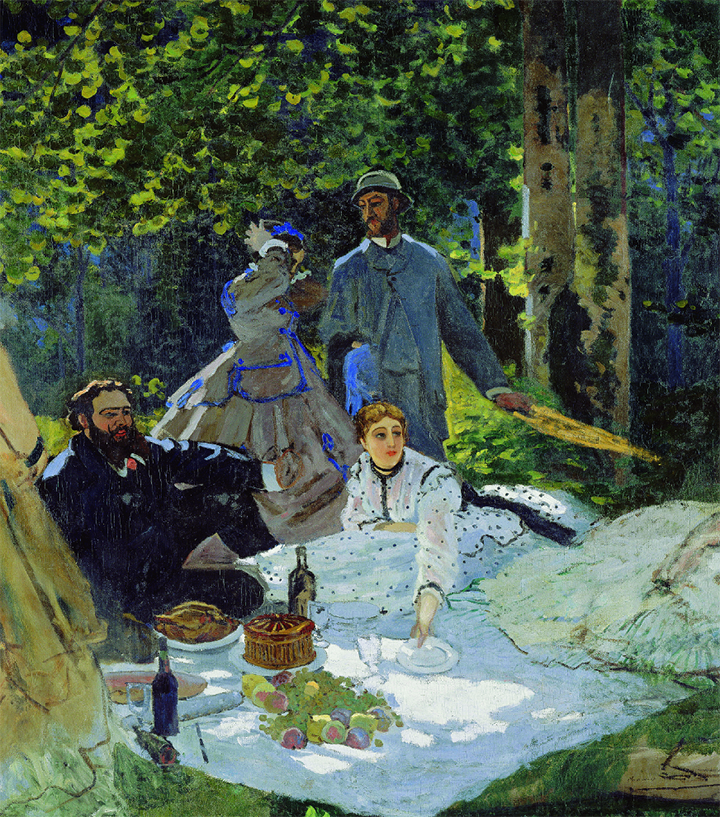 莫奈《草地上的午餐》共有三幅,据说第一幅由于尺寸太大,需要站在梯子上创作,导致莫奈不小心摔断了腿,这幅画也因不便保存被裁成了两幅。最终莫奈将画幅缩小重新绘制,还“赌气”把创作中经常对他提修改意见的“大胡子男”从画面中抹去;此外,这幅画中的树干上画着一个刻出来的心形,而画作中心的女性正是莫奈一生最爱的人——卡米耶,或许他正是在这场聚会中对卡米耶一见钟情……这些趣闻逸事,让大师形象变得更加立体鲜活。