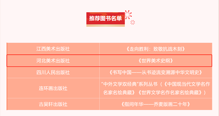 2025年11月,由中国图书评论学会担任指导单位,中国出版协会美术出版工作委员会主办、《中国美术》杂志承办的“《中国美术》杂志2025年‘美术好书’双月榜”评选活动在京召开专家评审会。其中,河北美术出版社《世界美术史纲》一书入选。 该活动是为深入贯彻落实党的二十大精神,传承弘扬中华优秀传统文化,推动美术出版高质量发展,广泛推介优秀美术图书,引导美术创作和研究方向,提升大众审美水平而举办,由《中国美术》杂志部分编委担任评委。