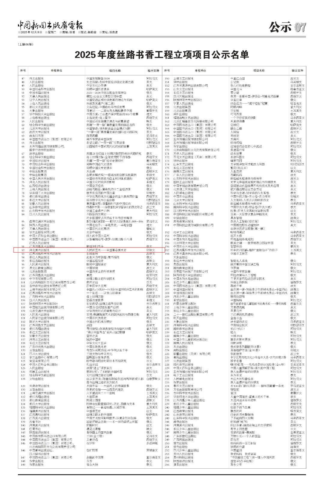 近日,2025年国家“走出去”重点工程“丝路书香工程”立项名单公布,河北美术出版社《人民的艺术——中国革命美术史》印地文版成功入选。