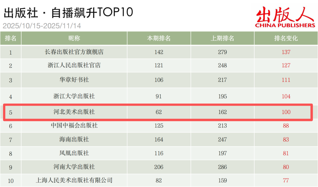 据《出版人杂志》统计,2025年10月15日至11月14日,河北美术出版社抖音账号进入出版社自播带货能力Top20,出版社•自播飙升Top10。
