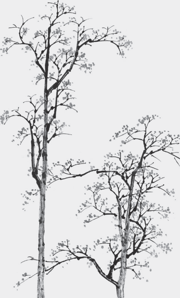 3. 枝干要有偃仰揖让的姿态,不要画得左右对称。要注意前后枝及疏密关系,力求做到自然、生动,特别是出枝的行笔走向及前后枝的交搭,一定要合乎生长规律。即所谓:“发干,固当左繁则右简,右繁则左简,不可排对而出;生枝,亦须左密则右疏,右密则左疏,不可齐头而列”。(清代布颜图《画学心法问答》) 4. 用笔要注意粗细、转折和顿挫的变化,既不可轻飘虚浮,又不能迟滞粗硬。 5. 要掌握步骤、条理。初学者宜先画干、后画枝,抓住形象特征,注意前后层次,大胆落笔,才能画得活而有生气。 画小树、远树也可先从树顶画起,逐步生发,穿插成林,用淡墨中锋写其大形,再以重墨枝条叠压于前或闪躲于后,求得错综变化。画枝繁的大树,亦可从掩干的前枝画起。 |
