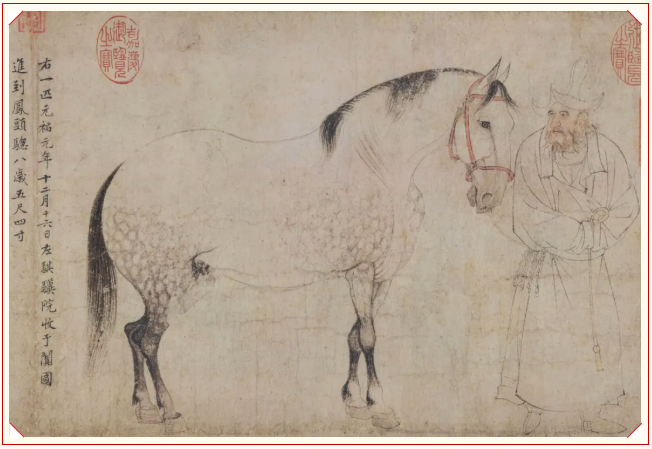 画面中的五马外形和神态各不相同。在白描的勾勒之下,五马体态特征尽显,它们肌肉饱满,体格壮硕,形态匀称,形体的轮廓与真实的马匹无二,十分生动写实。 李公麟运用墨色的明暗深浅对比来突显五马不同部位的特征以及颜色的差异,如马蹄部位与马身大部分区域的明暗程度就存在明显差异,这也符合多数马的真实样貌。 常言道“眼睛是心灵的窗户”,李公麟对于马匹眼睛部位的描绘也达到了极高的水准,通过观赏画中马的眼睛,观者仿佛能够透过眼睛看到马的内心世界。从右到左,第一匹马名为“凤头骢”,于阗国进贡,由一位头戴皮毛帽的胡人奚官牵引。奚官回头看凤头骢,凤头骢也微微垂头看着奚官,人与马视线相对,描绘传神。 |