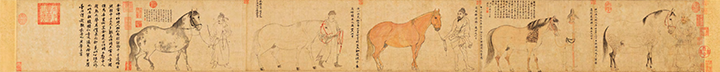 《五马图》是李公麟描绘五组“一人一马”的画作,兼具极高的写实性和表现性。 画中从右到左依次描绘了五匹骏马,每一匹马都由一名奚官牵引。五马包括“凤头骢”“锦膊骢”“好头赤”“照夜白”及“满川花”。 |