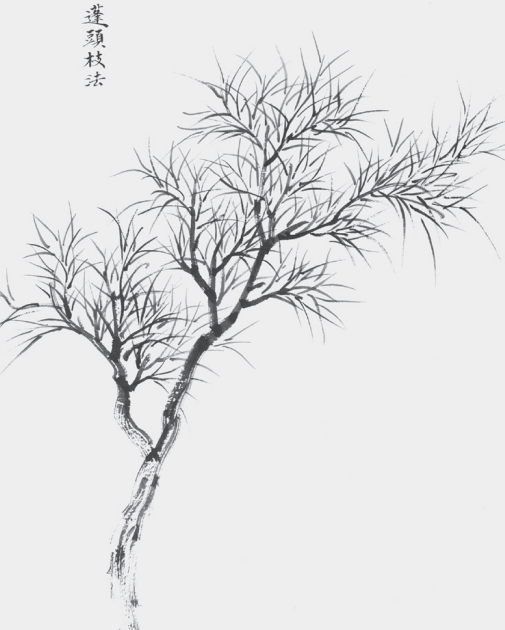 生枝向上,枝条较长、较直、较细、较密,树的形态较为端正规整,梢顶较齐。干宜挺生,转折处多用方笔。穿枝应统一,参差得法,自然有致。由于主枝与细枝的关系看上去形似扫帚样,因名“扫帚枝”,多用以表现冬、春季节的枯树。