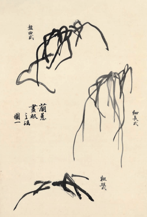 自然界兰花的根分为 “地生根” 和 “气生根” 两种类型。地生根较粗而少分枝(如九头兰),气生根细长而分枝。但在绘画作品中,由于历代画家的艺术创造,兰蕙之根的形象变化反而比生活中的多起来了。大致可归纳为盘曲、细长、粗短、多岐、丁头和弧形六种。 |